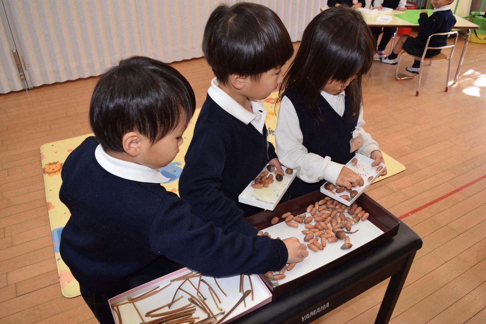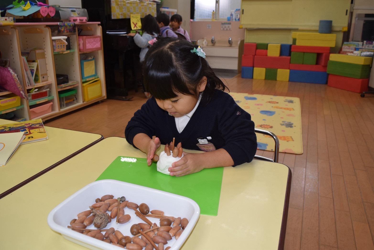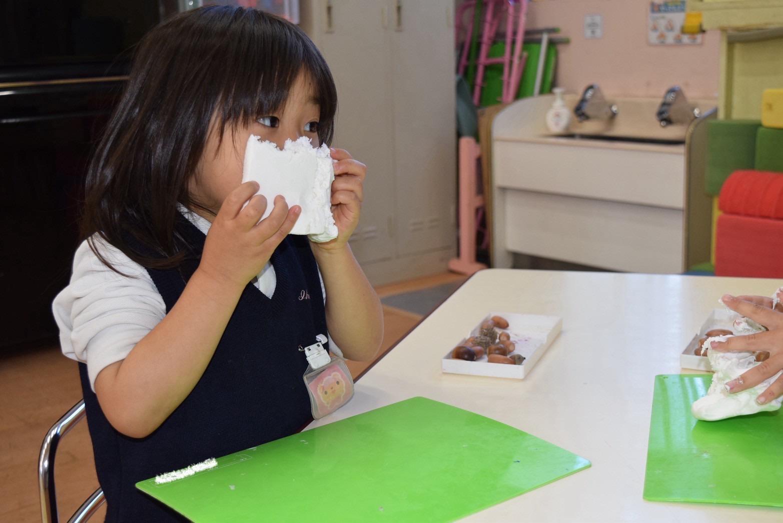 また、11月に羽根木公園へ遠足に行った時に拾った、どんぐりを使い、様々などんぐり遊びも楽しみました。どんぐりケーキ作りでは、園で初めて【紙粘土】を扱いました。普段遊んでいる粘土とは少し違った素材に、興味津々👀「匂いが違うね」「ふわふわだね!」