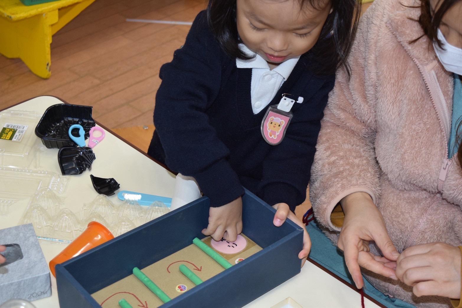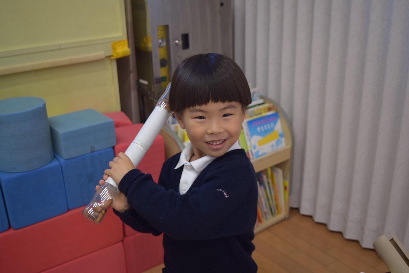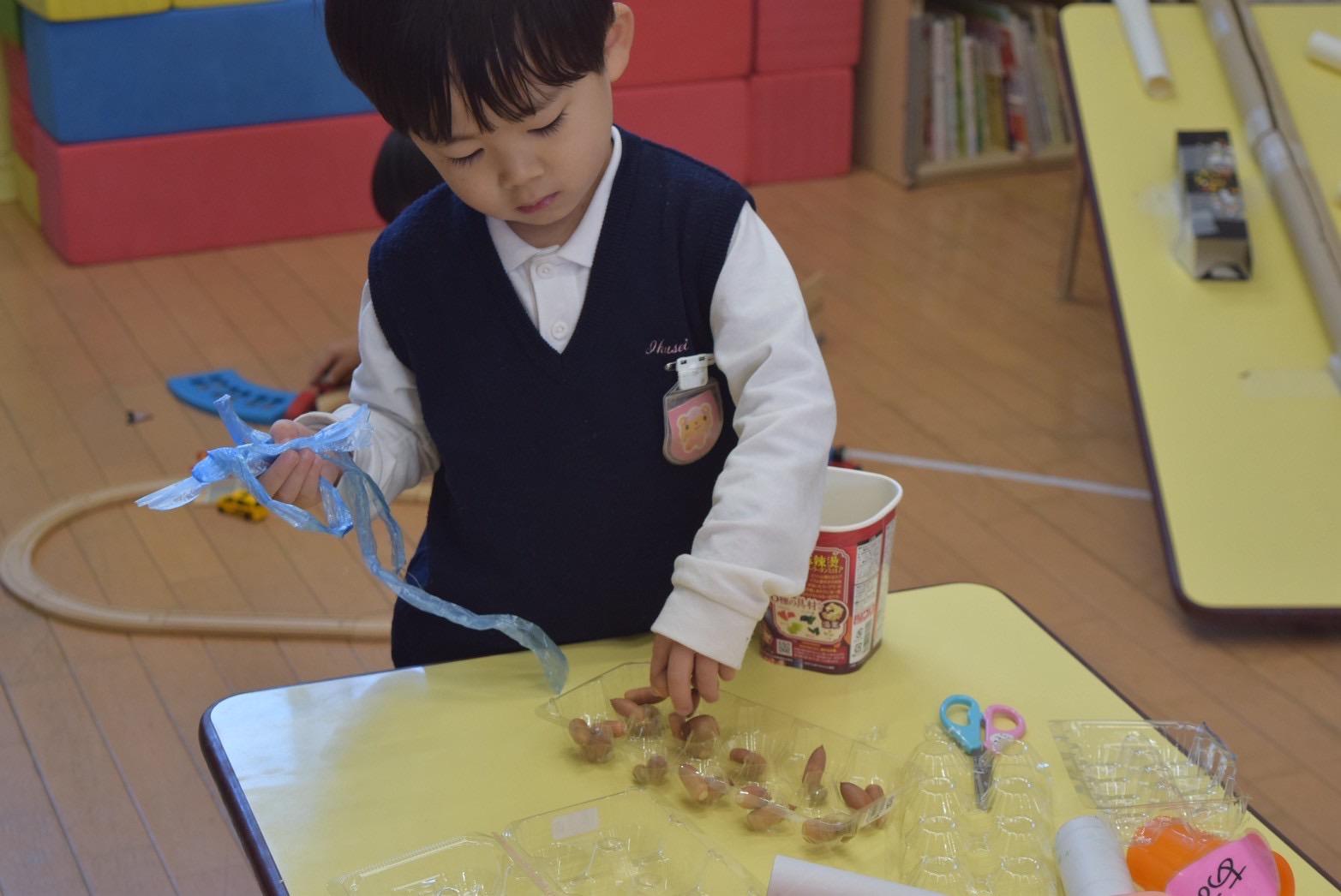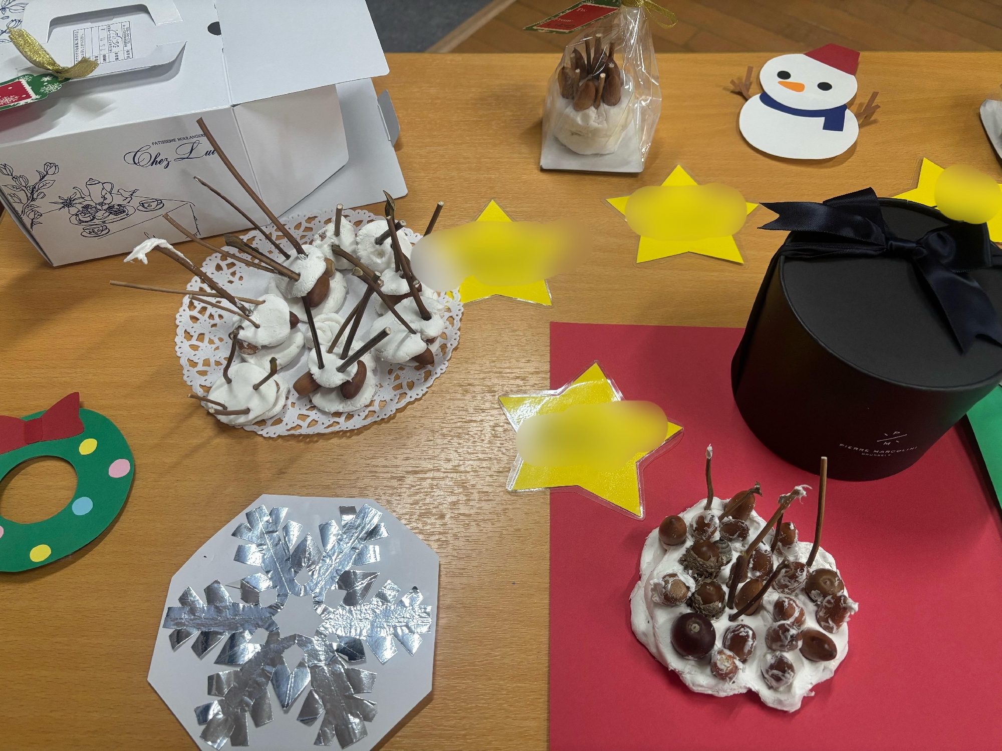 また、11月に羽根木公園へ遠足に行った時に拾った、どんぐりを使い、様々などんぐり遊びも楽しみました。どんぐりケーキ作りでは、園で初めて【紙粘土】を扱いました。普段遊んでいる粘土とは少し違った素材に、興味津々👀「匂いが違うね」「ふわふわだね!」