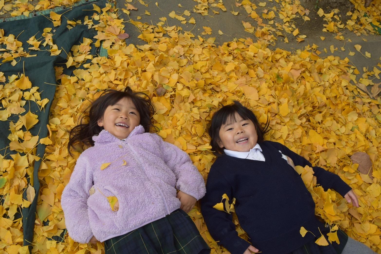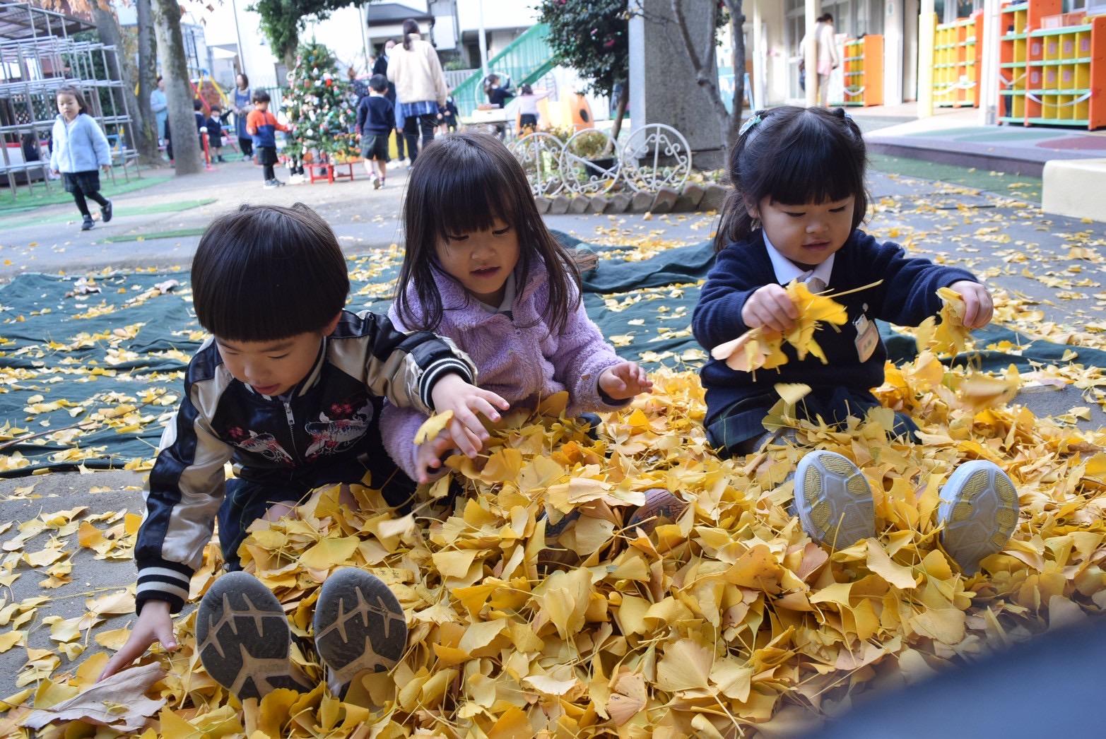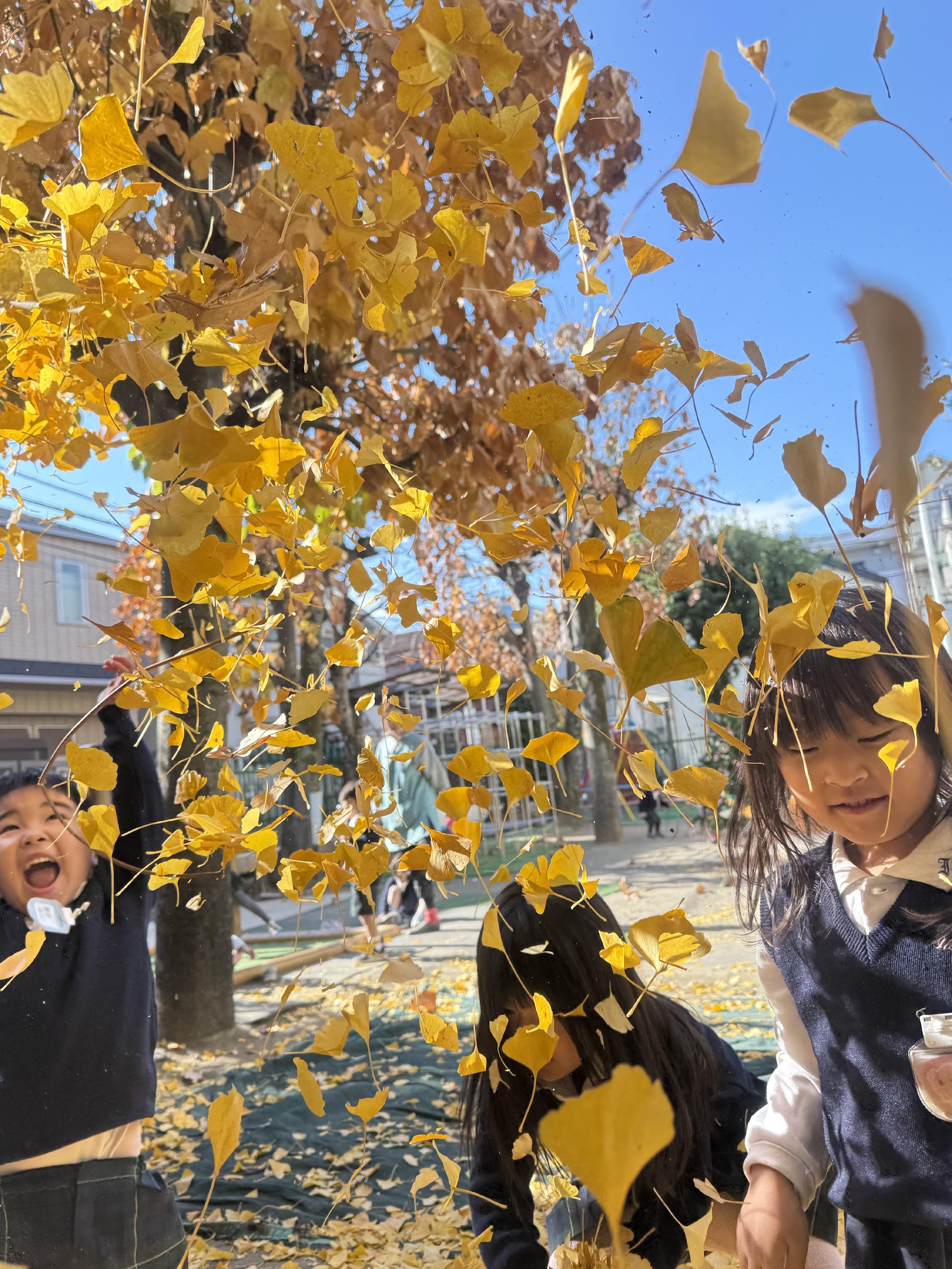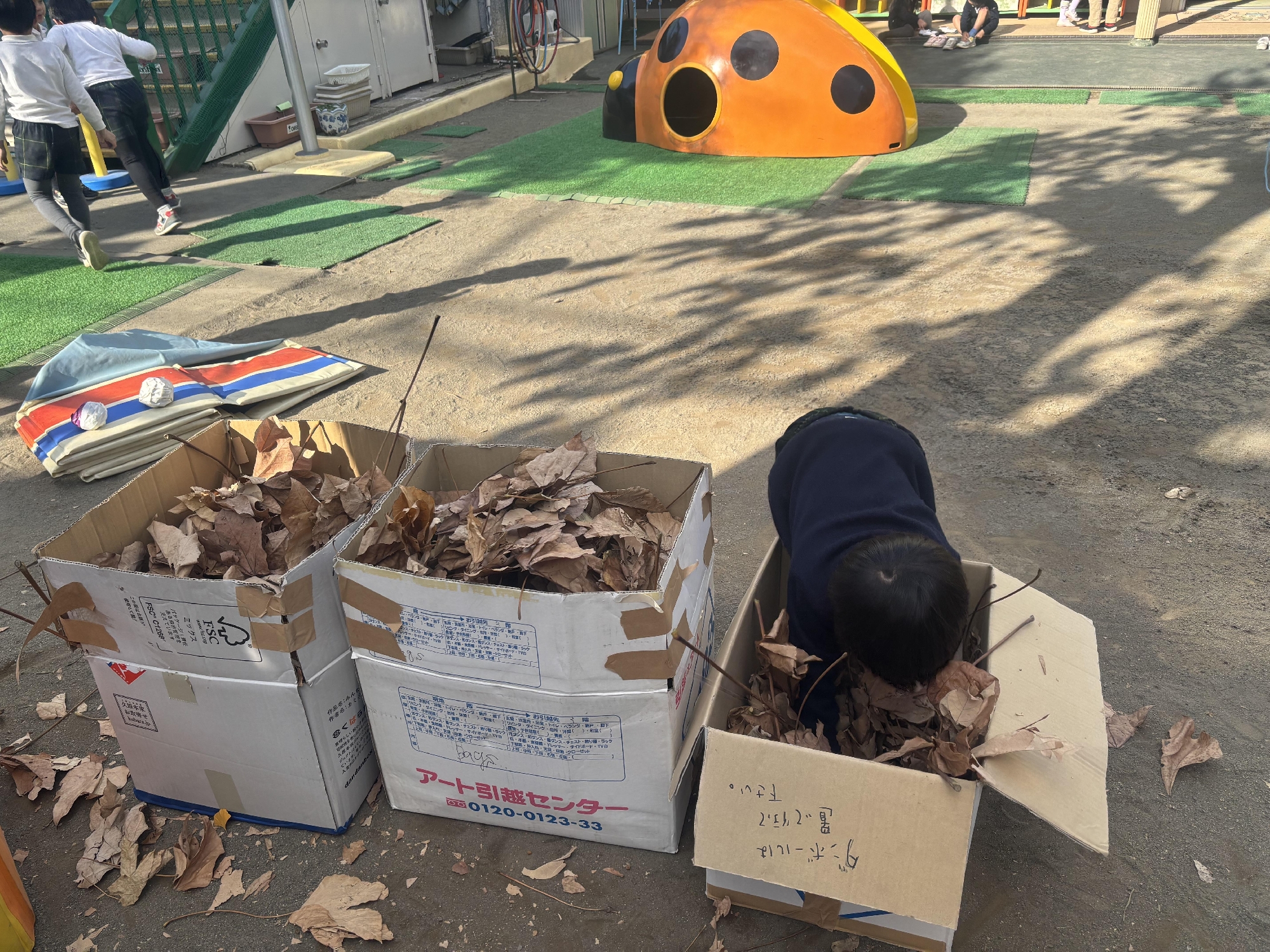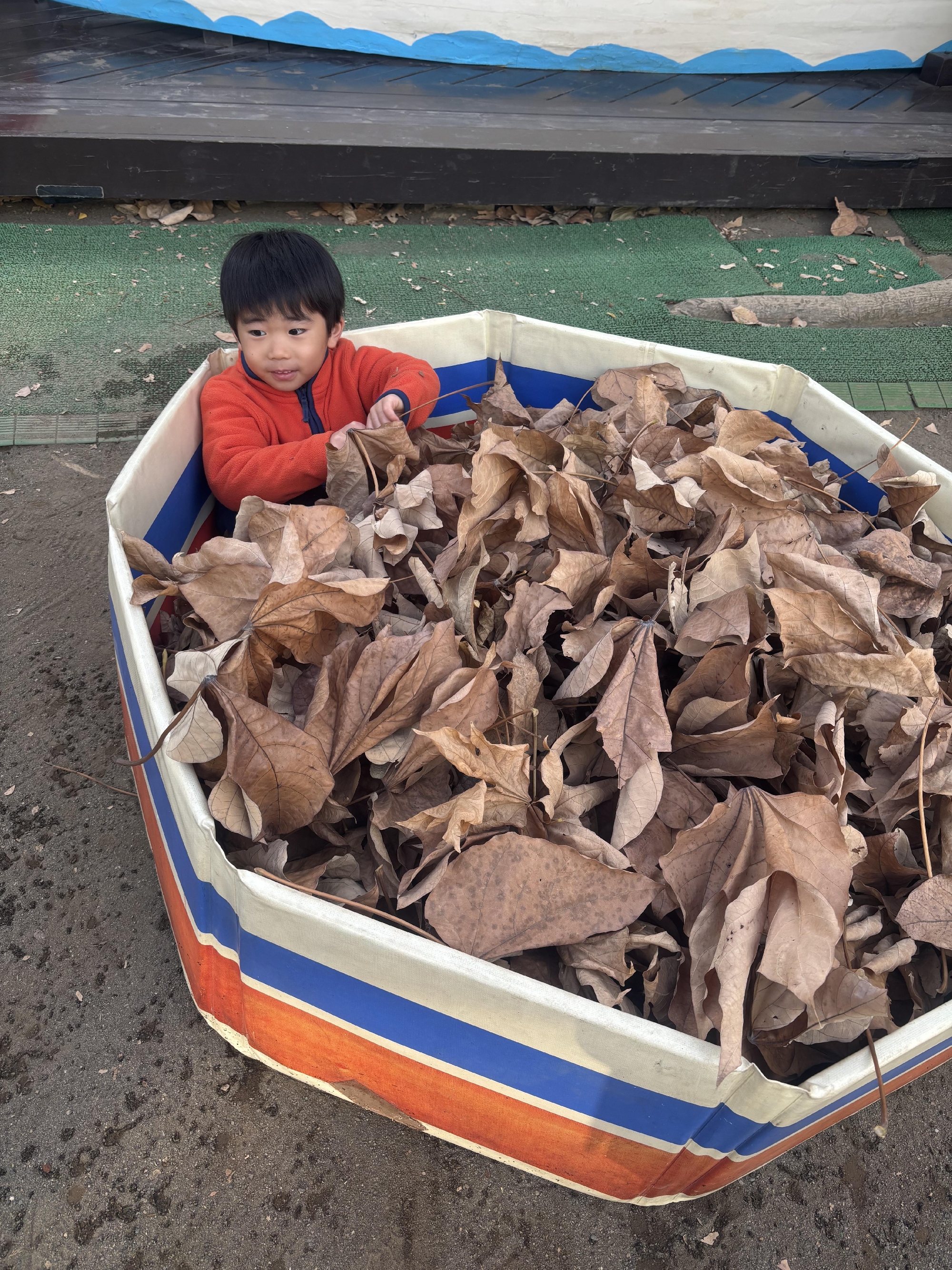秋の園庭には、落ち葉がいっぱい!子どもたちは、落ち葉で遊ぶことが大好きです♪大きな青桐の葉を集めて、【葉っぱ束🎀】にしたり、葉っぱを魚に見立てて【釣り🎣】をしたり…。イメージ豊かに楽しむ姿を見て、改めて子どもたちの発想力に関心しました☺️そして毎年人気なのが…葉っぱプール。プールに集めた葉っぱの中に、ザブーン!!