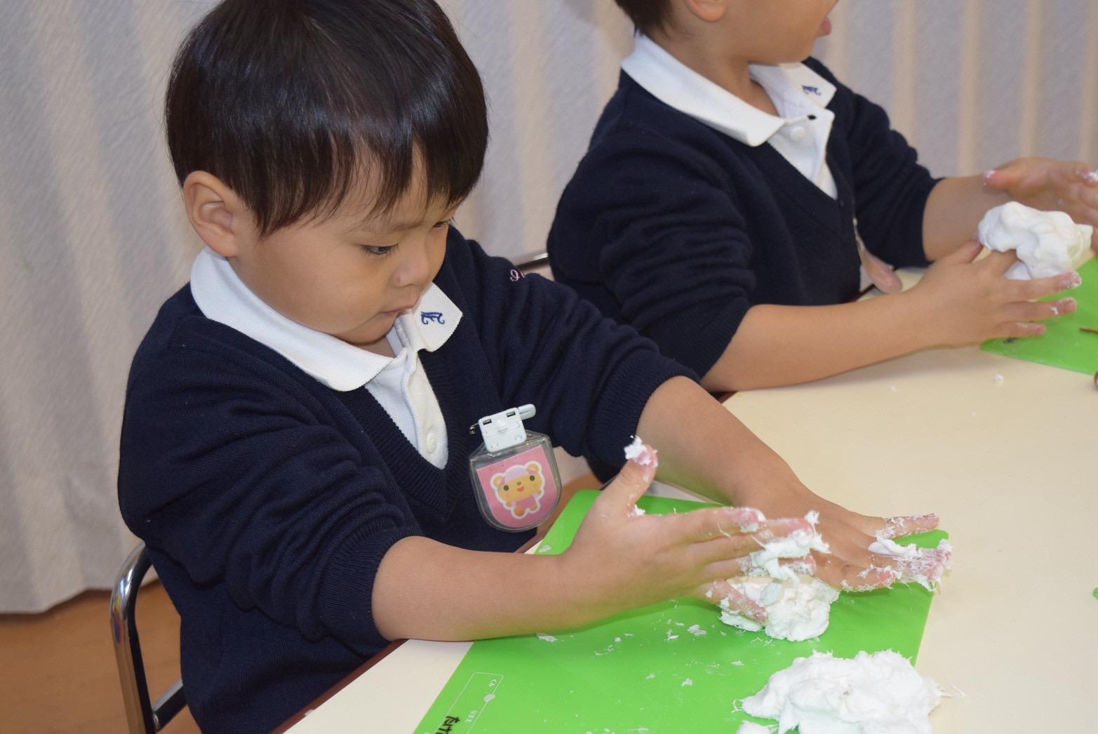 (後ろの子たちは、登園してすぐ、紙粘土の固まり具合をチェックしてます)