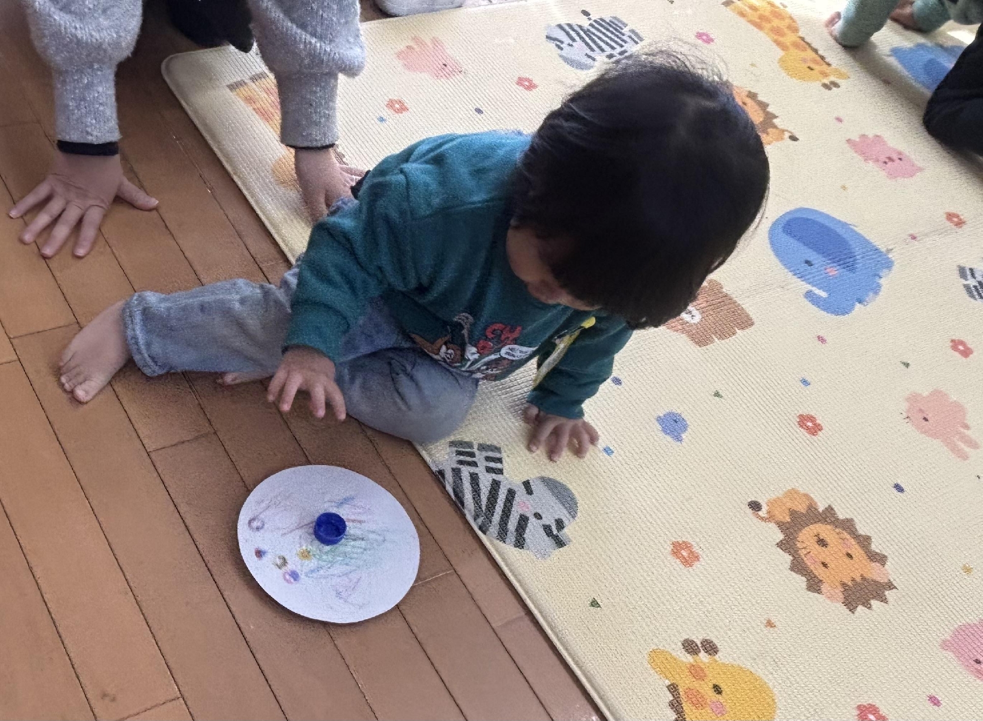 先日行ったバナナ組(1歳児)でも、コマの製作を楽しみました。くるくる回る様子を楽しんでいましたよ!